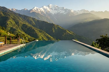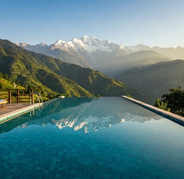 Unmatched Views – 180-degree panoramic views of the Ram Ganga River, majestic Himalayan peaks, and lush green valleys.